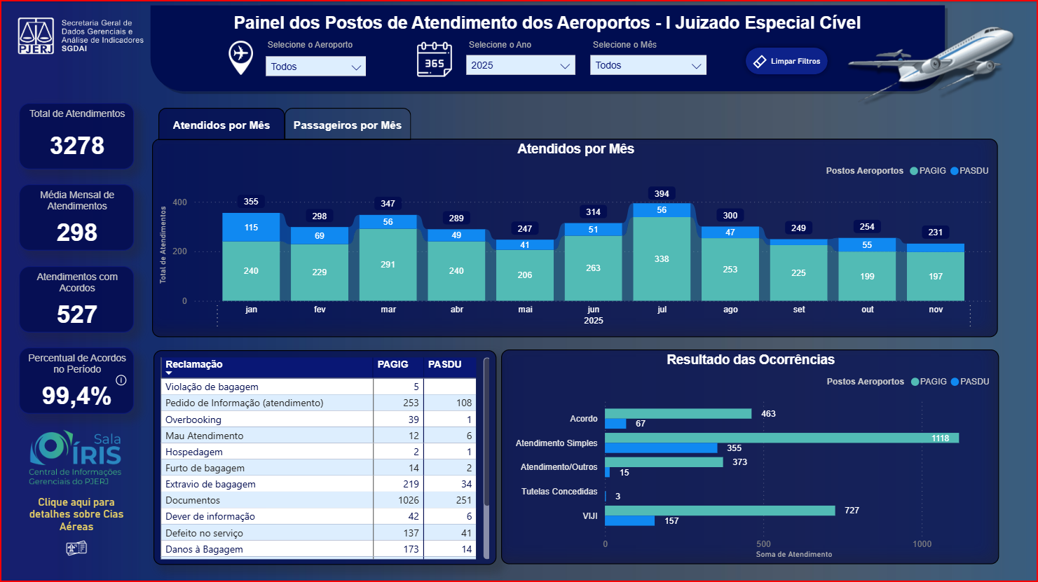 Por meio de visualizações intuitivas e filtros dinâmicos, o painel possibilita o acompanhamento da evolução mensal dos atendimentos, a identificação de picos de demanda e a comparação entre postos e companhias aéreas. A segmentação por tipo de reclamação evidencia os principais motivos que levam os cidadãos a buscar atendimento, enquanto os indicadores de resultado permitem avaliar o nível de resolutividade, com destaque para a realização de acordos.