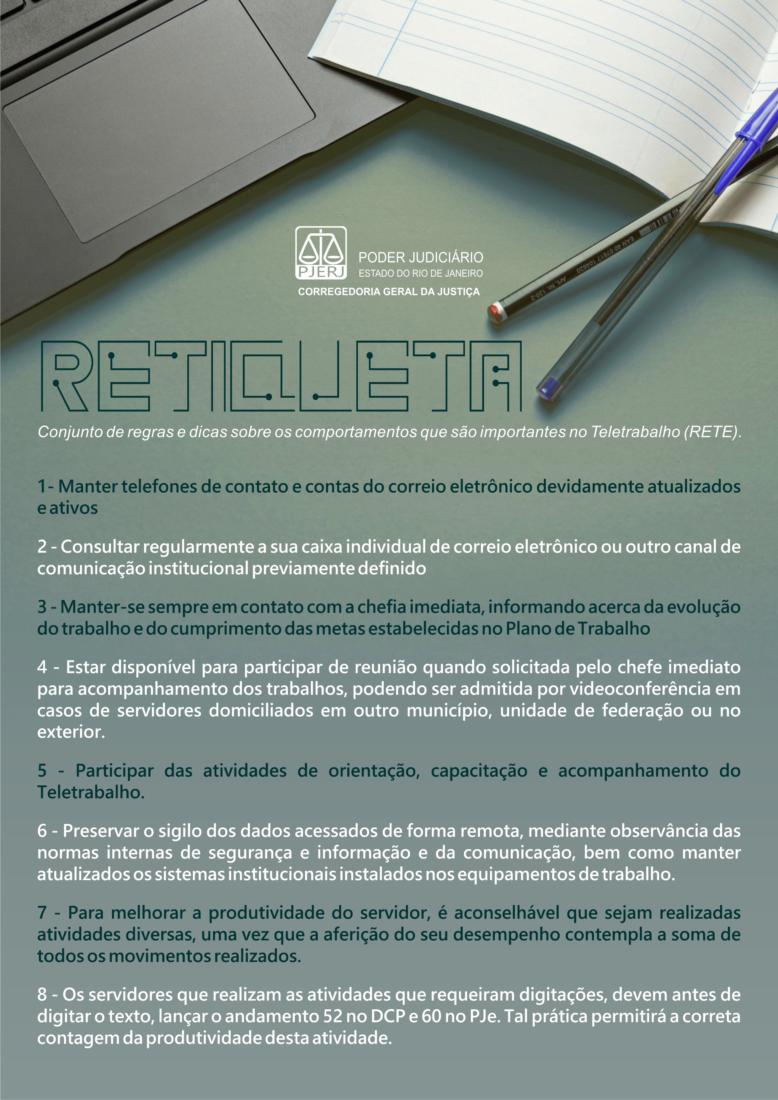 Durante a audiência pública, foi ainda lançada a Cartilha do RETE, um compilado de normas e orientações para auxiliar o servidor nas atividades do teletrabalho e a “retiqueta”, com regras e dicas de etiqueta importantes a serem seguidas para o bom desempenho e estabelecimento de melhor interação do servidor em RETE com o seu gestor.