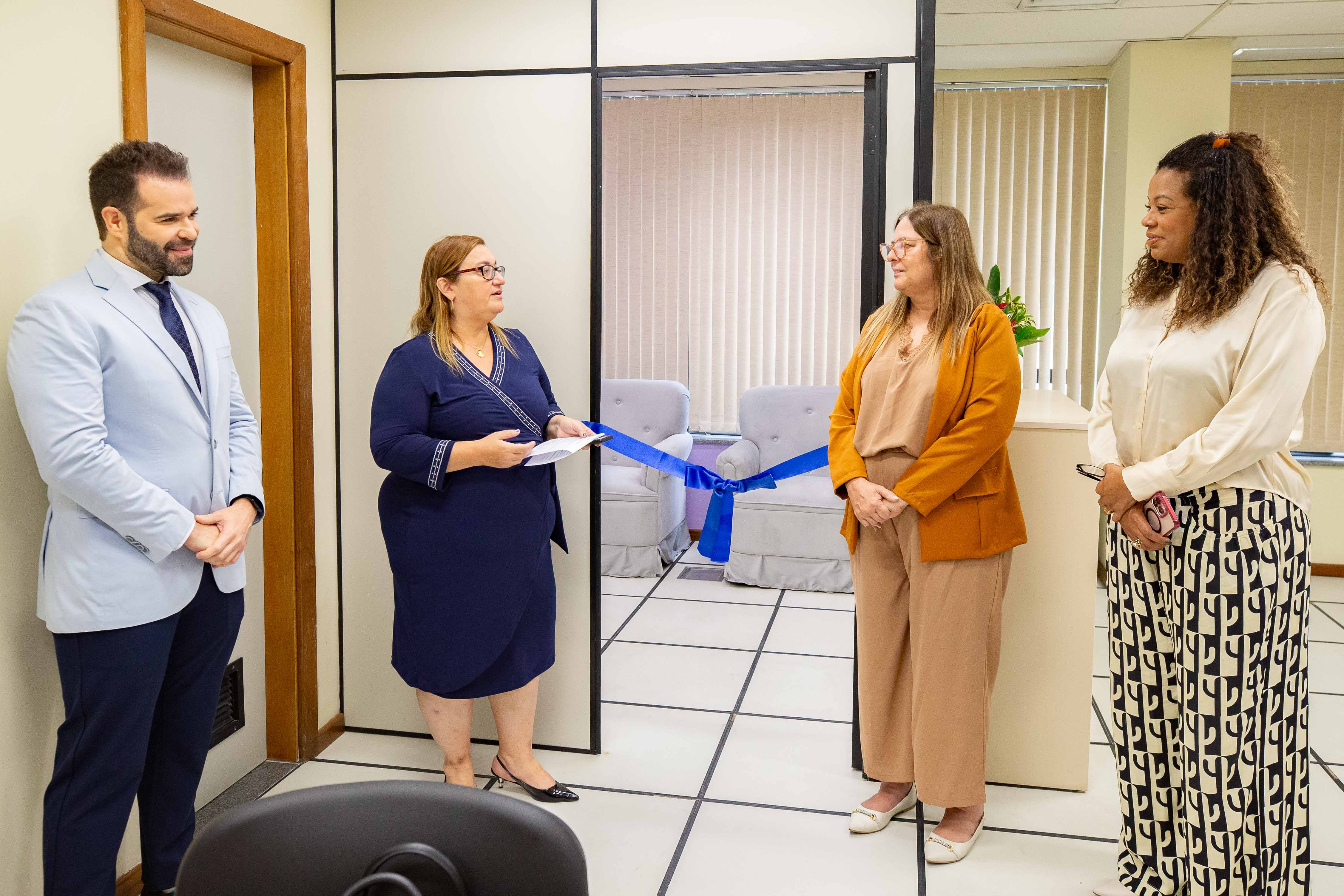 O juiz dirigente do 12º NUR, Eric Scapim, a juíza diretora do Fórum do Méier, Cláudia Márcia Gonçalves Vidal, a tutora da Sala de Apoio à Amamentação, Abilene Gouvea, e a presidente da Comissão OAB Mulher, Luciene Mourão, participam da cerimônia de inauguração