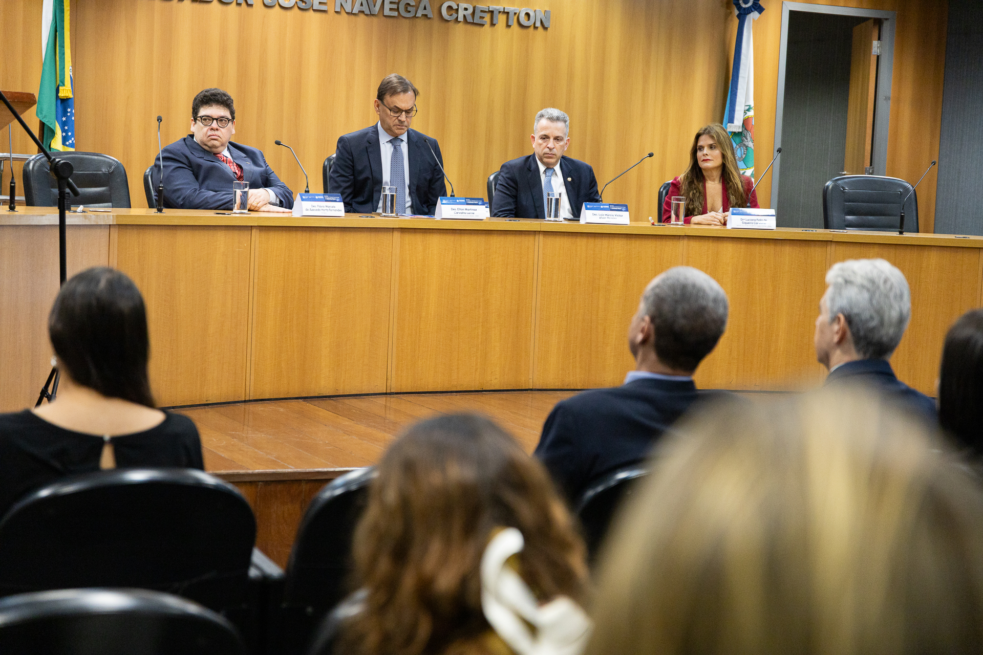 Da esquerda para a direita, estão à mesa de abertura os desembargadores Flavio Marcelo Fernandes, Elton Leme e Luiz Marcio Pereira e a juíza Luciana Fiala de Siqueira Carvalho, membra do Cedes