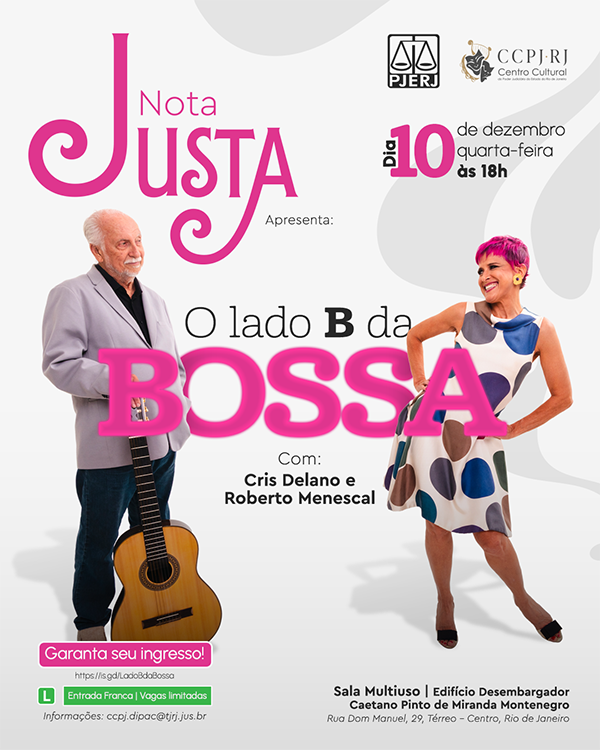 Uma noite para relembrar clássicos da bossa nova. O Programa Nota Justa, do Centro Cultural do Poder Judiciário (CCPJ), apresentará o show "O lado B da Bossa" com a presença ilustre do compositor Roberto Menescal e da cantora Cris Delanno.