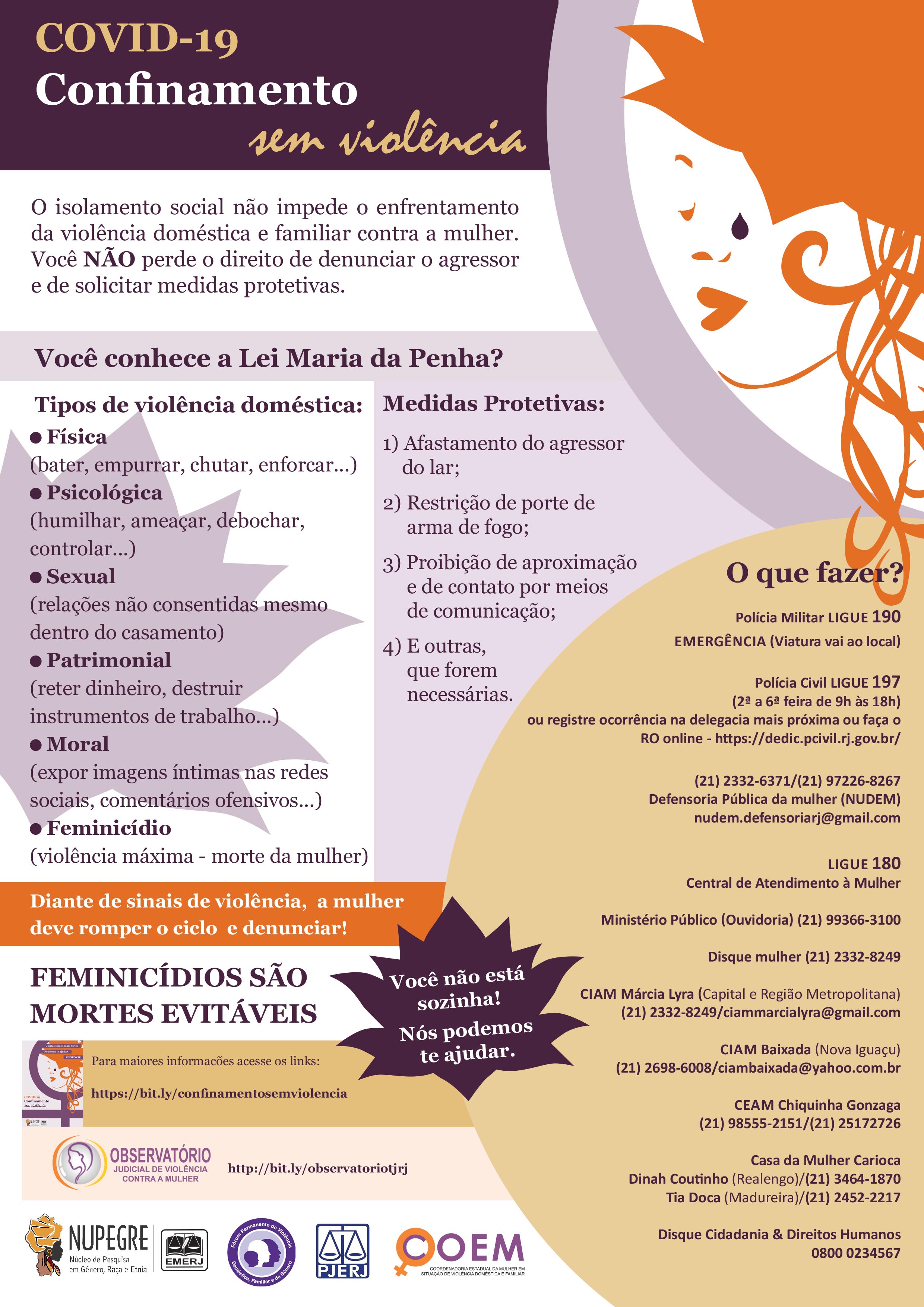 Com o auxílio da Patrulha Maria da Penha, cartazes da campanha “Covid-19 - Confinamento sem Violência” foram divulgados em locais públicos e de grande circulação de pessoas, como farmácias, supermercados e igrejas. Elaborada pela Coordenadoria Estadual da Mulher em Situação de Violência Doméstica e Familiar (COEM) do Tribunal de Justiça do Rio de Janeiro (TJRJ), pela Escola da Magistratura do Estado do Rio de Janeiro (EMERJ) e pelo Núcleo de Pesquisa em Gênero, Raça e Etnia (NUPEGRE), a iniciativa faz parte de uma parceria com as polícias Civil e Militar que visa esclarecer e estimular que as vítimas de maus-tratos não se intimidem durante o período de distanciamento social provocado pela pandemia e denunciem os agressores.