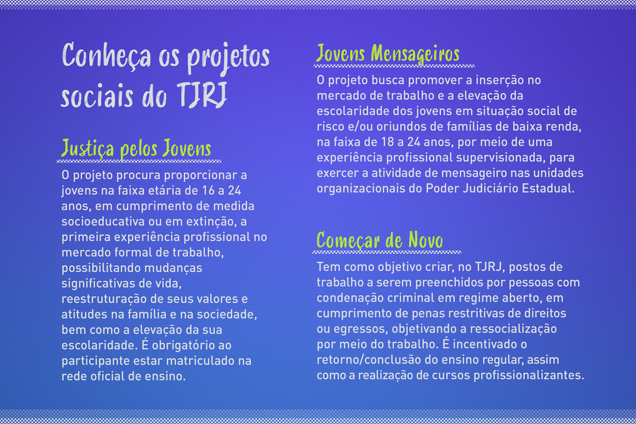 Os projetos sociais do TJRJ têm sido um importante instrumento de recomeço para muitos dos seus participantes. Dois deles, o Começar de Novo e o Justiça pelos Jovens, têm como seus integrantes, respectivamente, egressos do sistema penitenciário e jovens que já tiveram conflitos com a lei no passado. E, neles, a meritocracia também é a palavra de ordem, como acontece no Jovens Mensageiros. De 2011 a 2020, já foram contratados 88 ex-participantes das duas iniciativas como terceirizados.