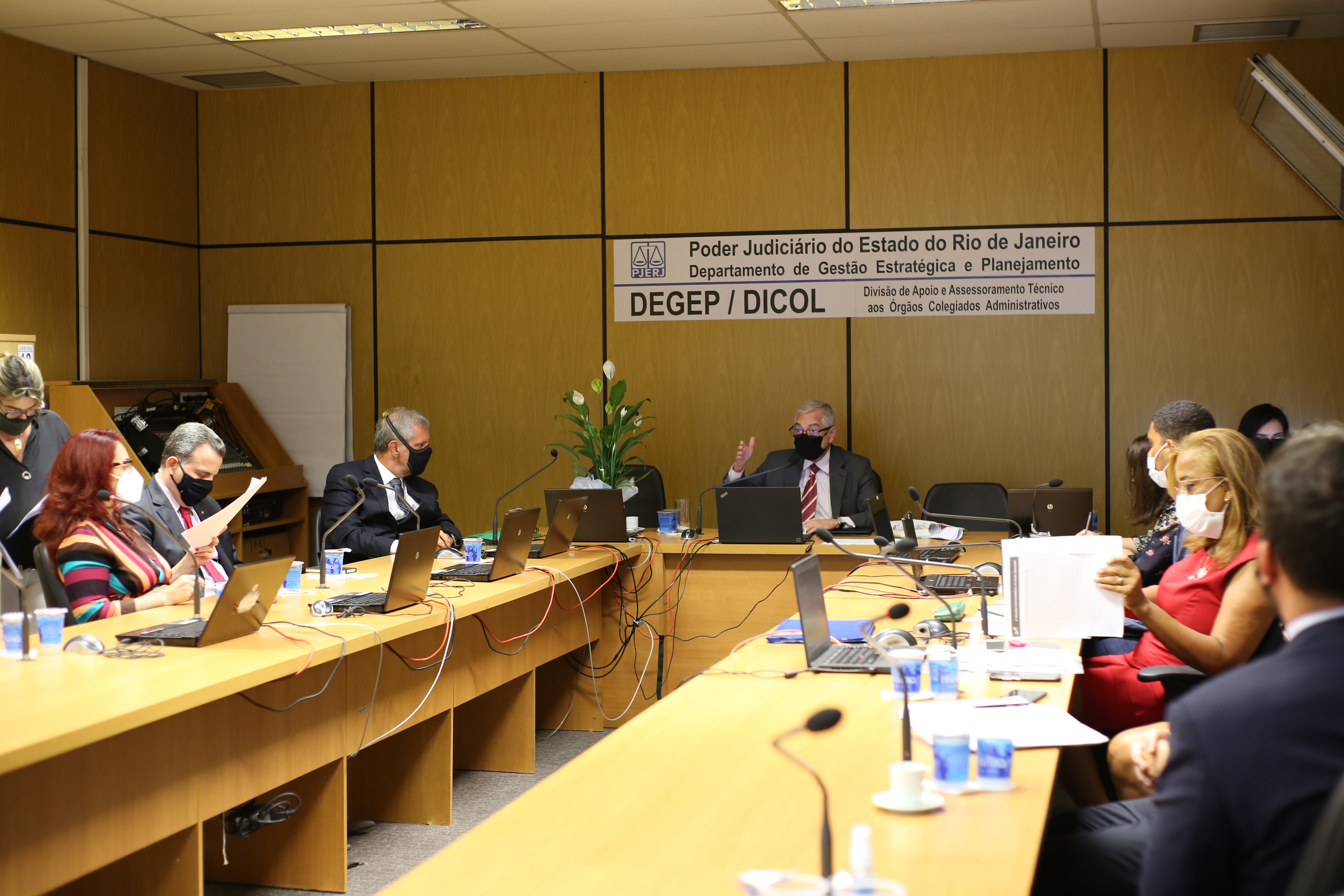 A reunião foi realizada em formato híbrido – presencialmente e on-line – e contou com a presença de dezoito pessoas, entre elas a juíza Admara Falante Schneider e a diretora da Divisão de Gestão Ambiental Andrea Salles, também integrantes da Cosus, além de representantes de diversos setores do TJRJ.