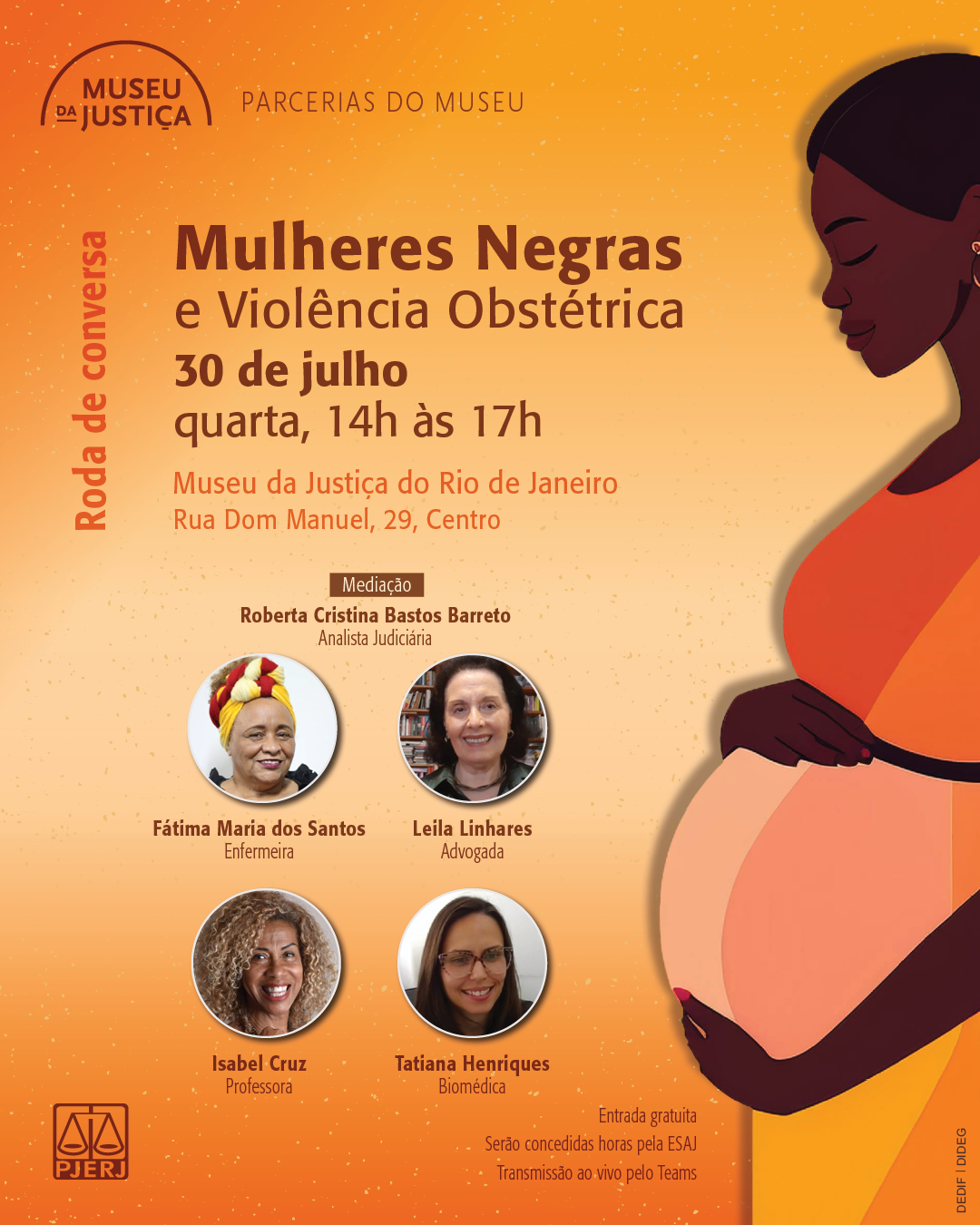 I Encontro Grupos Reflexivos Com autores de Violência Doméstica  Descrição: Encontro dos Grupos Reflexivos e Responsabilizantes para Homens Autores de Violência do Estado do Rio de Janeiro.  📅 Data e Horário 01 DEZ (1 de Dezembro)  10h às 17h (com intervalo das 13h às 14h30)  📍 Local Auditório Desembargador José Navega Cretton  Dom Manuel, s/nº | 7º andar  Palácio da Justiça | Centro | RJ  👥 Público-Alvo Equipes técnicas que atuam nos juizados de violência doméstica, EITCRMs, residentes e estagiários do Tribunal de Justiça do RJ, servidores e profissionais que atuam como facilitadores dos diversos grupos reflexivos realizados no território do Rio de Janeiro (SEAP, Polícia Militar, prefeituras, CEJUSCs), gestores das secretarias da Mulher dos Municípios e do Estado.  🔗 Inscrição e Programação Inscreva-se pelo link: https://forms.office.com/r/VjQejRfu3i (ou acesse o QR Code)  Acesse a programação.Mulheres Negras na Sociedade Brasileira Contemporânea rompendo as Barreiras da Invisibilidade - Data e Horário 27 NOV 9h às 13h30 - nscrições Inscreva-se pelo link ou acesse: https://forms.office.com/r/JzNDRIgvz9Logos: PJERJ, Museu da Justiça, COEM, GT Mulheres Negras e ESAJ. Programa: Parcerias do Museu. Título: Roda de Conversa – Mulheres Negras e Violência Obstétrica.Fátima Maria dos Santos – Enfermeira, servidora pública e ativista com atuação voltada à promoção dos direitos das mulheres e à saúde pública.   Leila Linhares – Advogada. Professora Emérita da EMERJ e Professora do Curso de Pós Graduação Gênero e Direito da mesma instituição.   Isabel Cruz – Professora Titular da UFF, com doutorado em Enfermagem (USP) e atuação na docência e pesquisa desde 1994.   Tatiana Henriques – Graduada em Biomedicina pela UNIRIO (2010), com Mestrado (2014) e Doutorado (2018) em Saúde Coletiva/epidemiologia pela UERJ. Professora adjunta da UERJ - IMS. Faz parte do grupo de pesquisa "Saúde da Mulher, da Criança e do adolescente" da Fundação Oswaldo Cruz/ENSP.  30 de julho, quarta-feira, das 14h às 17h   Sala Multiuso do Museu da Justiça   Edifício Des. Caetano Pinto de Miranda Montenegro     Rua Dom Manuel, 29, térreo – Centro, Rio de Janeiro   Entrada Franca | Capacidade: 60 pessoas   Transmissão e informações: https://www.tjrj.jus.br/web/museu/eventos   Classificação indicativa: Livre