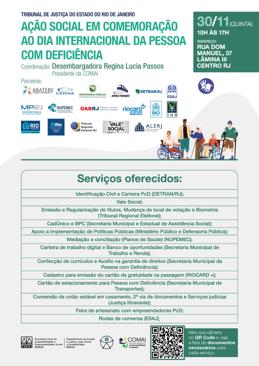 No dia 30 de novembro, das 10h às 17h, acontece, no Térreo da Lâmina III, do Tribunal de Justiça do Estado do Rio de Janeiro, na Rua Dom Manuel, 37, Centro, a Ação Social em Comemoração ao Dia Internacional da Pessoa com Deficiência.