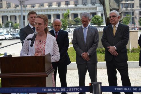 A Desembargadora Cristina Teresa Gaulia agradeceu a presença de todos que estavam ali em busca de um mesmo fim, de uma mesma luta: um ambiente ecologicamente saudável. Ela explicou como surgiu a ideia de criação de um Departamento de Projetos Especiais que engloba vieses de prestação jurisdicional alternativa, inclusão social e meio ambiente e sustentabilidade. O DEAPE foi instituído na gestão do Desembargador Sérgio Cavalieri, quando Presidente do TJERJ. O Desembargador aposentado esteve presente no evento e foi homenageado. “O Tribunal de Justiça do Rio de Janeiro é o único tribunal do país a ter um departamento de projetos especiais”, contou. Ao final, a Desembargadora brincou dizendo que já havia cumprido sua meta para ser feliz: "Ter filhos, plantar uma árvore e escrever um livro", como diz o dito popular.