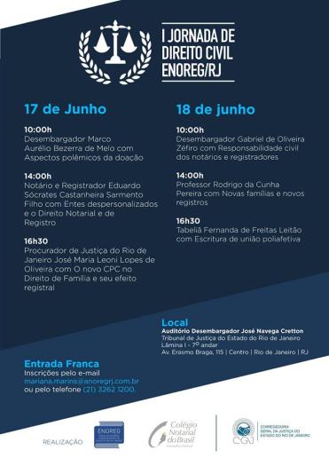 O auditório da Corregedoria Geral da Justiça sediará nos próximos dias 17 e 18 de junho, das 10h às 16h30, a I Jornada de Direito Civil do Colégio Notarial do Brasil seção Rio de Janeiro e da Escola de Notários e Registradores do Estado do RJ (Enoreg). O evento, que é gratuito, será realizado no auditório Desembargador José Navega Cretton, localizado no 7º andar, da lâmina I, do Fórum Central.