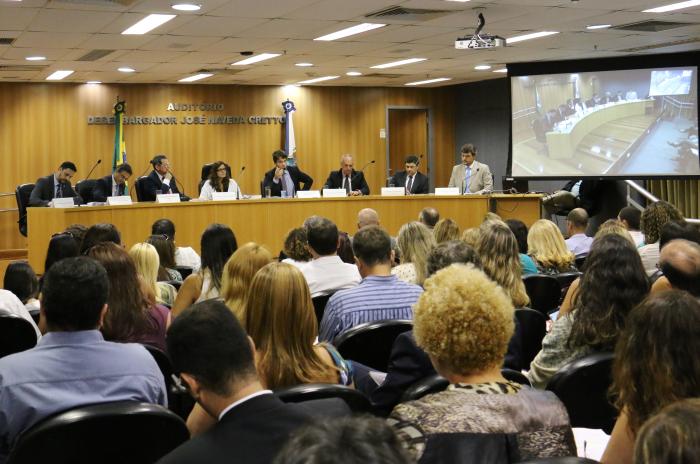 Notários, registradores e advogados de todo o estado lotaram o auditório para assistir à palestra ministrada pelos professores e registradores Eduardo Sócrates e Valestan Milhomem, e pelo debatedor, o professor e advogado Rodrigo de Castro. Participaram da mesa de abertura do evento, a juíza auxiliar da CGJ, Ana Lúcia Vieira do Carmo; o juiz titular da Vara de Registro Público da Capital, Marcius da Costa Ferreira; o presidente da ENOREG, Marcelo Poppe de Figueiredo Fabião; o presidente da Associação dos Notários e Registradores do Rio de Janeiro (ANOREG), Carlos Firmo; o diretor-geral de Fiscalização e Apoio às Serventias Extrajudiciais (DGFEX), Marcelo El-Jaick; e o diretor da Divisão de Monitoramento Extrajudicial (DIMEX), José Euclides Guinâncio. A juíza auxiliar da CGJ, Regina Lúcia Chuquer de Almeida Costa de Castro e Lima, também esteve presente.