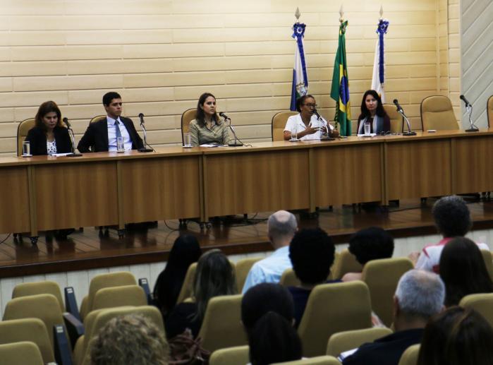 O juiz auxiliar da Corregedoria, Afonso Henrique Barbosa, abriu o evento ao lado das assistentes sociais Sânzia Rodrigues, Maria Aparecida Evangelista, Carla Schiavo e Jussara Ferreira (conselheira do Conselho Regional de Serviço Social do Rio de Janeiro).