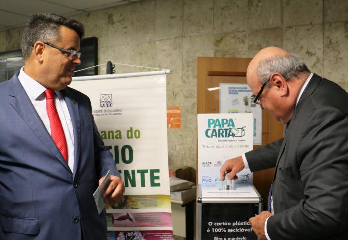 Em comemoração ao Dia do Meio Ambiente, celebrado em 5 de junho, o Tribunal de Justiça do Estado do Rio de Janeiro promoveu uma série de iniciativas como a campanha “Papa Cartão”, lançada nesta quinta-feira (8/6), para incentivar a coleta e a trituração de cartões de plástico (débito, crédito e cartões-presente, entre outros) que perderam a validade. O presidente do TJRJ, desembargador Milton Fernandes, e o corregedor-geral da Justiça, desembargador Claudio de Mello Tavares, prestigiaram a solenidade conduzida pelo desembargador Jessé Torres, presidente da Comissão de Políticas Institucionais para Promoção da Sustentabilidade (COSUS) do TJRJ.
