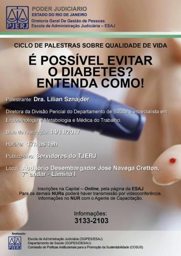 É possível evitar o diabetes? A médica do trabalho Lilian Aznajder, diretora da Divisão Pericial do Departamento de Saúde e especialista em Endocrinologia e Metabologia vai proferir uma palestra amanhã (14/11), das 17h às 19h, no Auditório José Navega Cretton. Inscrições on-line para a capital na página do Esaj. Há previsão de videoconferência para os demais NURs. Mais informações: 3133.2103.