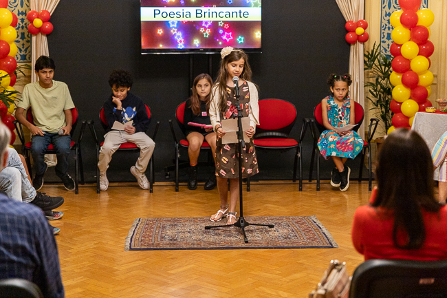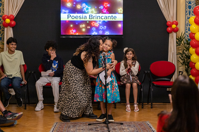 A criançada criou suas próprias poesias, exaltando o que significa ser criança. Maria Luiza Lemos Macieira, de nove anos, carinhosamente chamada de Malu, foi a primeira a ler e celebrou o brilho da infância em seus versos. Já Helena Bahamon, de oito anos, declarou com a sinceridade típica da idade que uma coisa que ela não quer é se tornar adulta. Em seu poema, destacou a beleza das diferenças entre as pessoas e como cada um tem um jeito especial de ser. No fim, ainda recebeu um beijo da mãe, que celebrou a coragem e o talento da filha durante a apresentação.