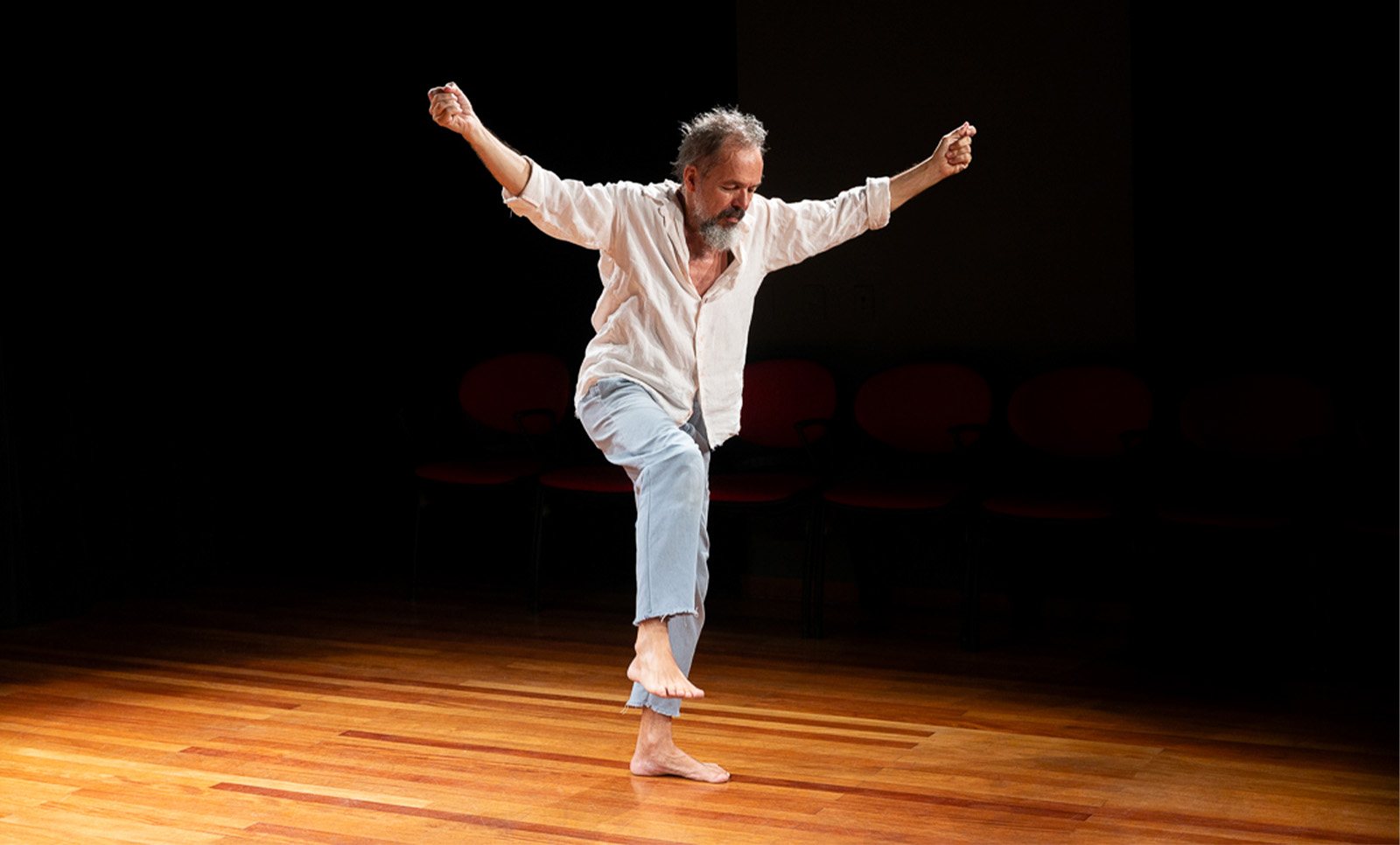 O ator Júlio Adrião agradece ao público após apresentação do monólogo "A Descoberta das Américas"