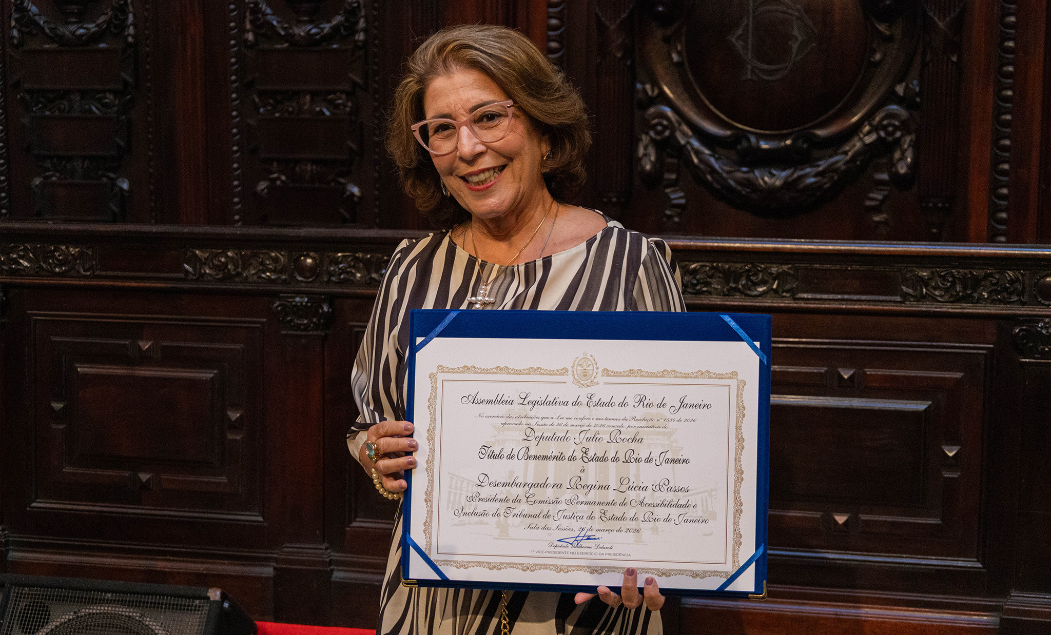 Desembargadora Regina Lúcia Passos recebe o Título de Benemérito do Estado do Rio de Janeiro durante solenidade no Palácio Tiradentes, em reconhecimento à sua atuação