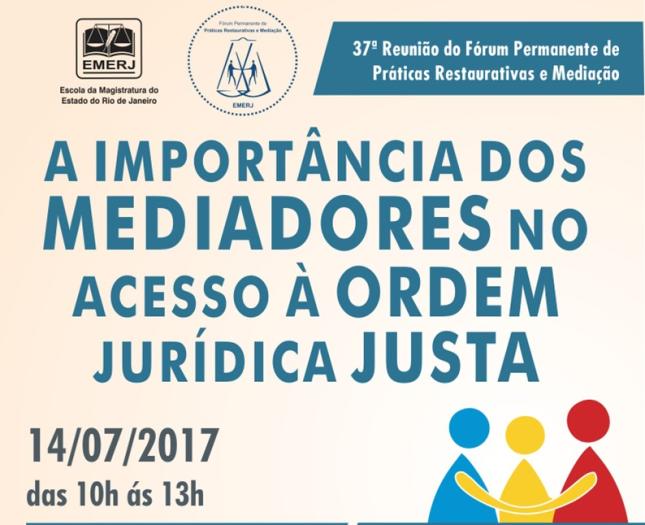O Fórum Permanente de Práticas Restaurativas e Mediação da Escola da Magistratura do Rio de Janeiro promoverá a palestra “A Importância dos Mediadores no Acesso à Ordem Jurídica Justa”, na próxima sexta-feira, dia 14 de julho, das 10h às 13h, no Auditório Antônio Carlos Amorin, localizado na Av. Erasmo Braga, 115, 4º andar, Centro.