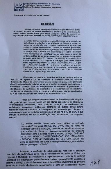 (...) Neste sentido, serve esta para notificar a entidade responsável por essa BIENAL DO LIVRO que, na forma da legislação federal e municipal, deverão ser recolhidas as obras que tratem do tema do homotransexualismo de maneira desavisada para o público jovem e infantil, ou seja, QUE NÃO ESTEJAM SENDO COMERCIALIZADAS EM EMBALAGEM LACRADA, COM ADVERTÊNCIA DE SEU CONTEÚDO, sob pena de apreensão dos livros e cassação de licença para a feira e demais que sejam cabíveis.”