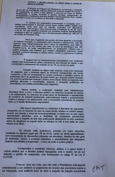 Não houve impedimento ou embaraço à liberdade de expressão, porquanto, em se tratando de obra de super-heróis, atrativa ao público infanto-juvenil, que aborda o tema da homossexualidade, é mister que os pais sejam devidamente alertados, com a finalidade de acessarem previamente informações a respeito do teor das publicações disponíveis no livre comércio, antes de decidirem se aquele texto se adequa ou não à sua visão de como educar seus filhos.