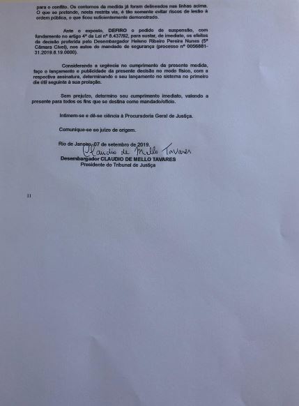 Ante o exposto, DEFIRO o pedido de suspensão, com fundamento no artigo 4º da Lei nº 8.437/92, para sustar, de imediato, os efeitos da decisão proferida pelo Desembargador Heleno Ribeiro Pereira Nunes (5ª Câmara Cível), nos autos do mandado de segurança (processo nº 0056881-31.2019.8.19.0000).