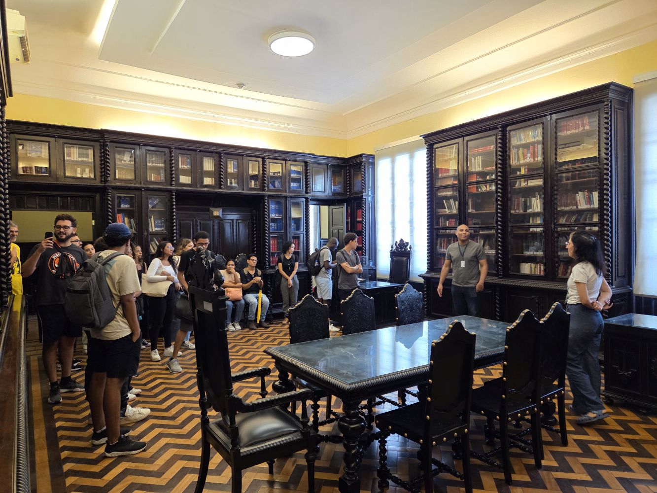 O Museu da Justiça recebeu nesta sexta-feira (11), um grupo de 20 estudantes da Universidade Federal Fluminense (UFF), dos cursos de Arquivologia, Direito, Segurança Pública e Produção Cultural. Sob a tutela do professor Delton Ricardo Soares Meirelles e mediação dos museólogos Ingrid Ribeiro e Leandro Pontes, o grupo percorreu os salões históricos do Museu da Justiça e conheceu as exposições em cartaz, em uma visita que proporcionou reflexões sobre a preservação da memória, a história da Justiça e a importância do patrimônio cultural no contexto acadêmico e social.
