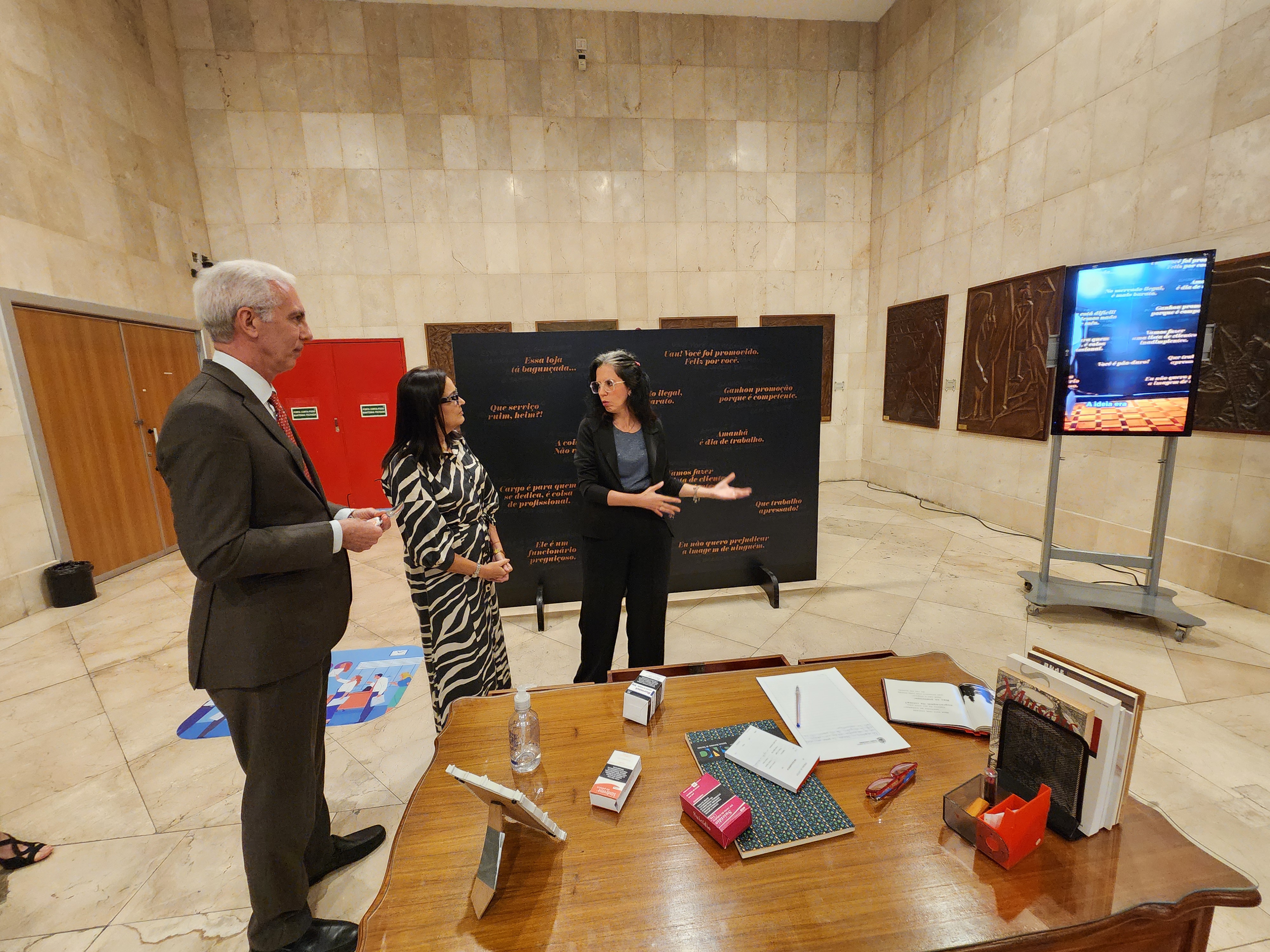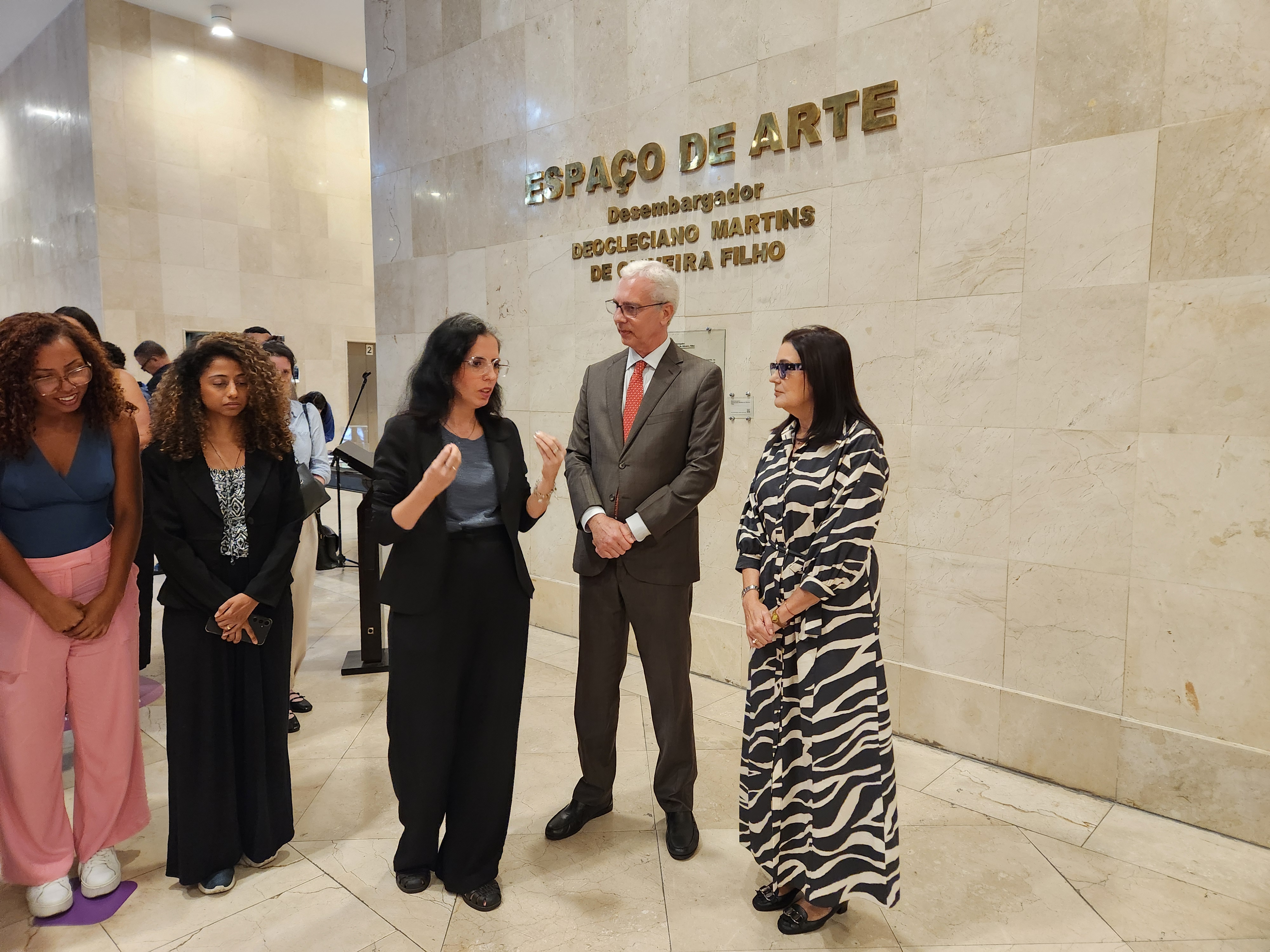 A exposição “Quem sente na pele”, originalmente pensada para o Museu da Justiça, foi inaugurada no hall de entrada do Lâmina III do TJRJ na tarde desta quarta-feira (13). Estiveram presentes o Des. Wagner Cinelli, presidente dos Cogens, Desa. Patrícia Serra Vieira, vice-presidente dos Cogens e Siléa Macieira, diretora do Museu da Justiça com falas na abertura da instalação.