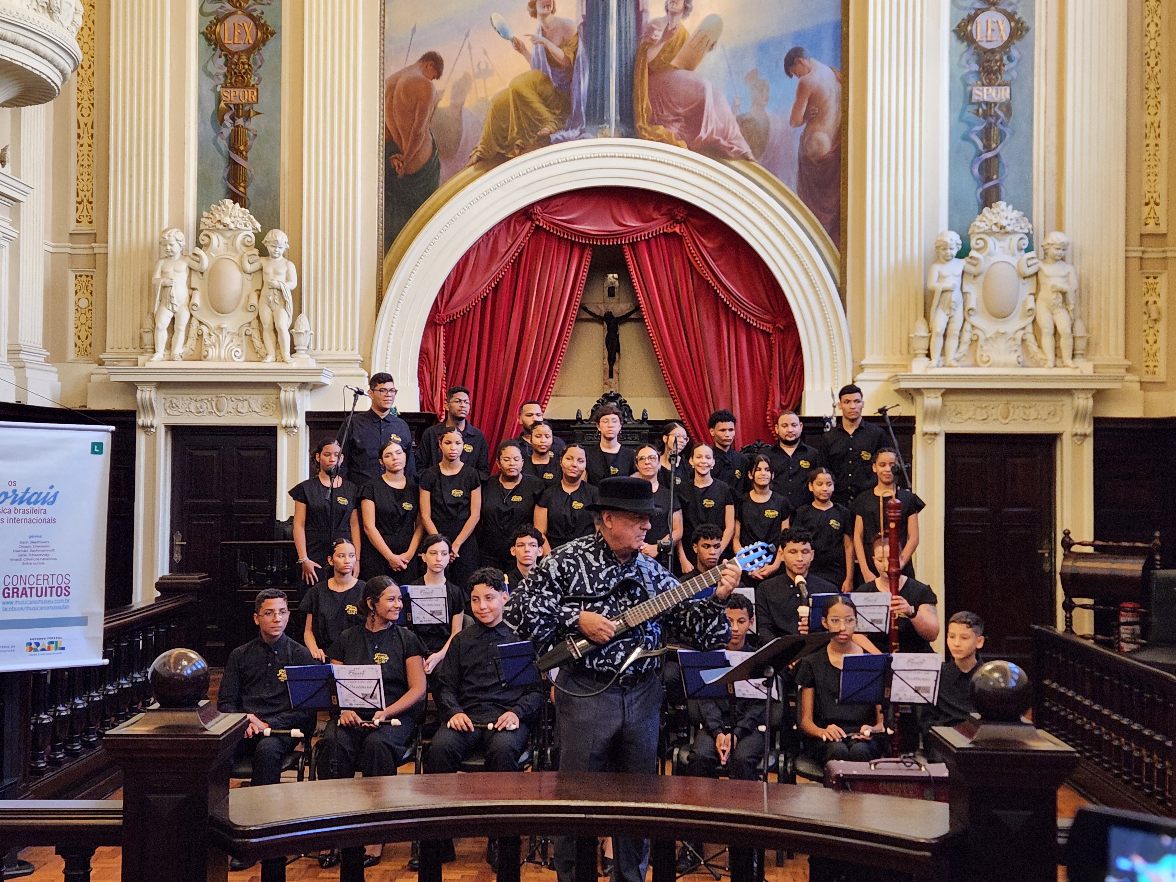 O programa Música no Museu recebeu, na tarde desta quinta-feira (15), a Orquestra e Coral Flauta Mágica, de Cuiabá, Mato Grosso, para a apresentação “Os Imortais da Música Brasileira e os Gênios Internacionais” no Tribunal do Júri. O repertório foi repleto de canções de grandes compositores como Tom Jobim, Lô Borges, Dominguinhos e Heitor Villa-Lobos em arranjos próprios.