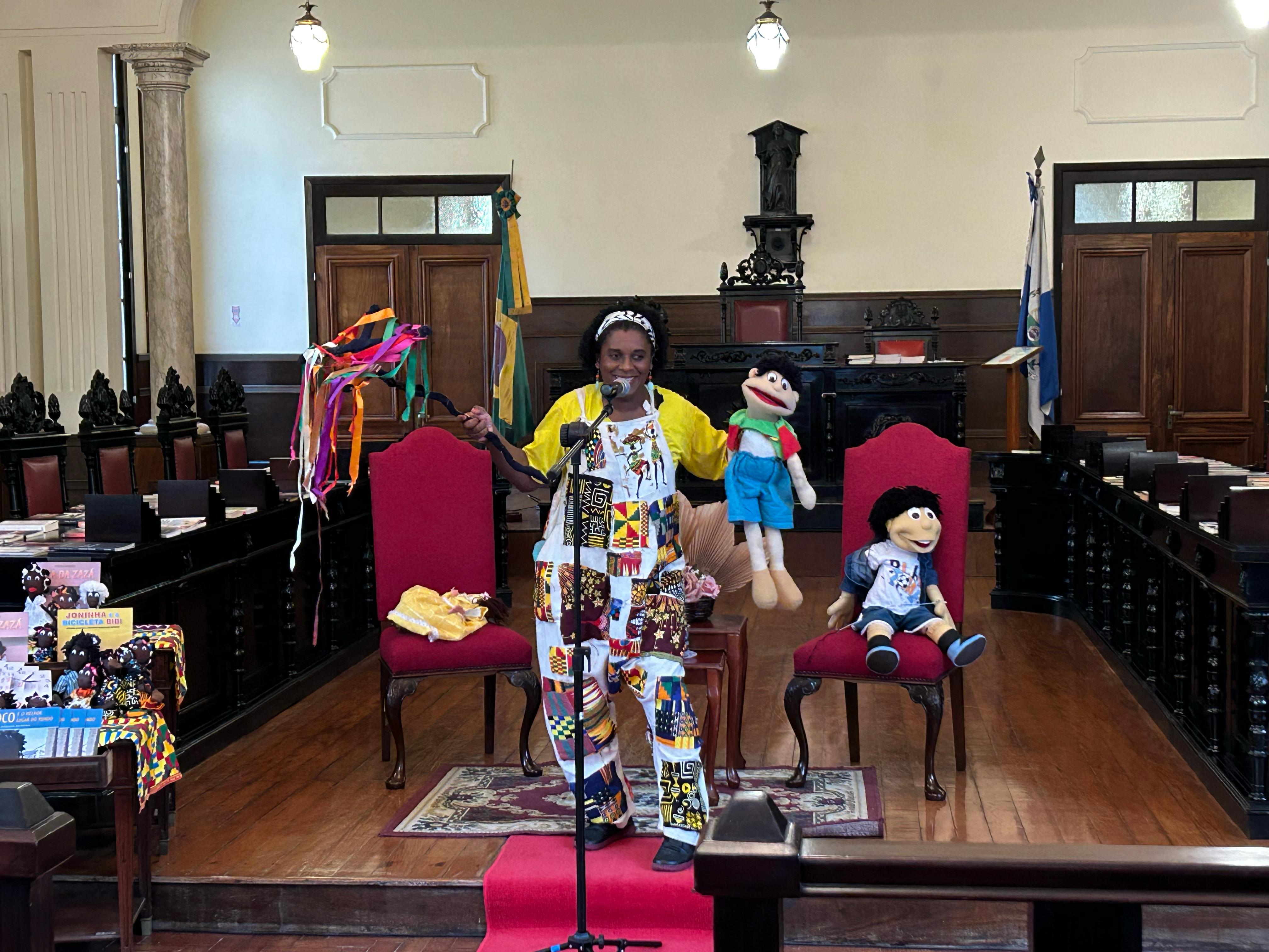 Débora Moreno, além de ter contado sobre a própria trajetória pessoal e profissional, também cativou o público por meio de uma contação de história teatralizada. “Lolita Braço de Fita”, primeiro livro da autora, foi interpretado com marionetes de pano e participação das crianças presentes.