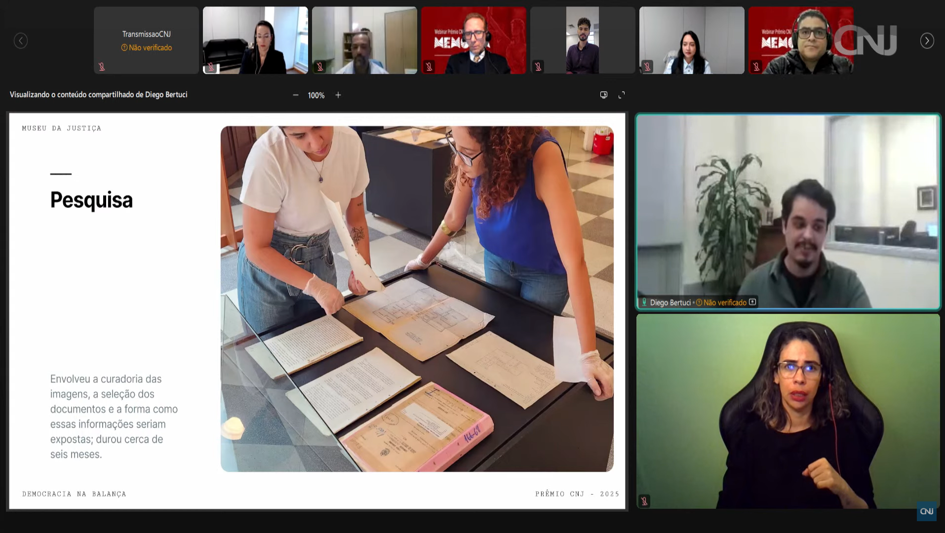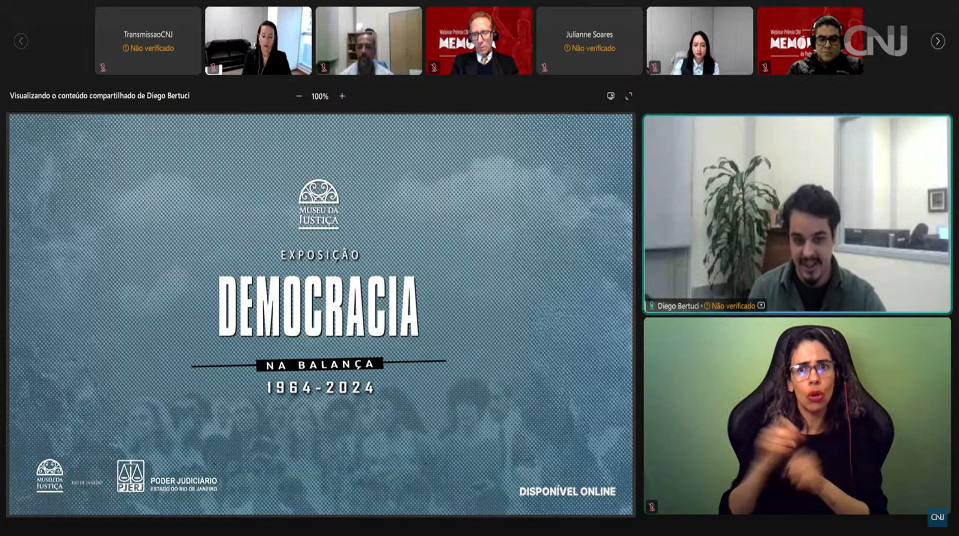 O historiador Diego Bertuci, do Museu da Justiça, apresentou webinário do Prêmio CNJ de Memória do Poder Judiciário 2025 sobre a produção da exposição “Democracia na Balança”, vencedora na categoria de Patrimônio Cultural Museológico, na tarde desta quinta-feira (03).