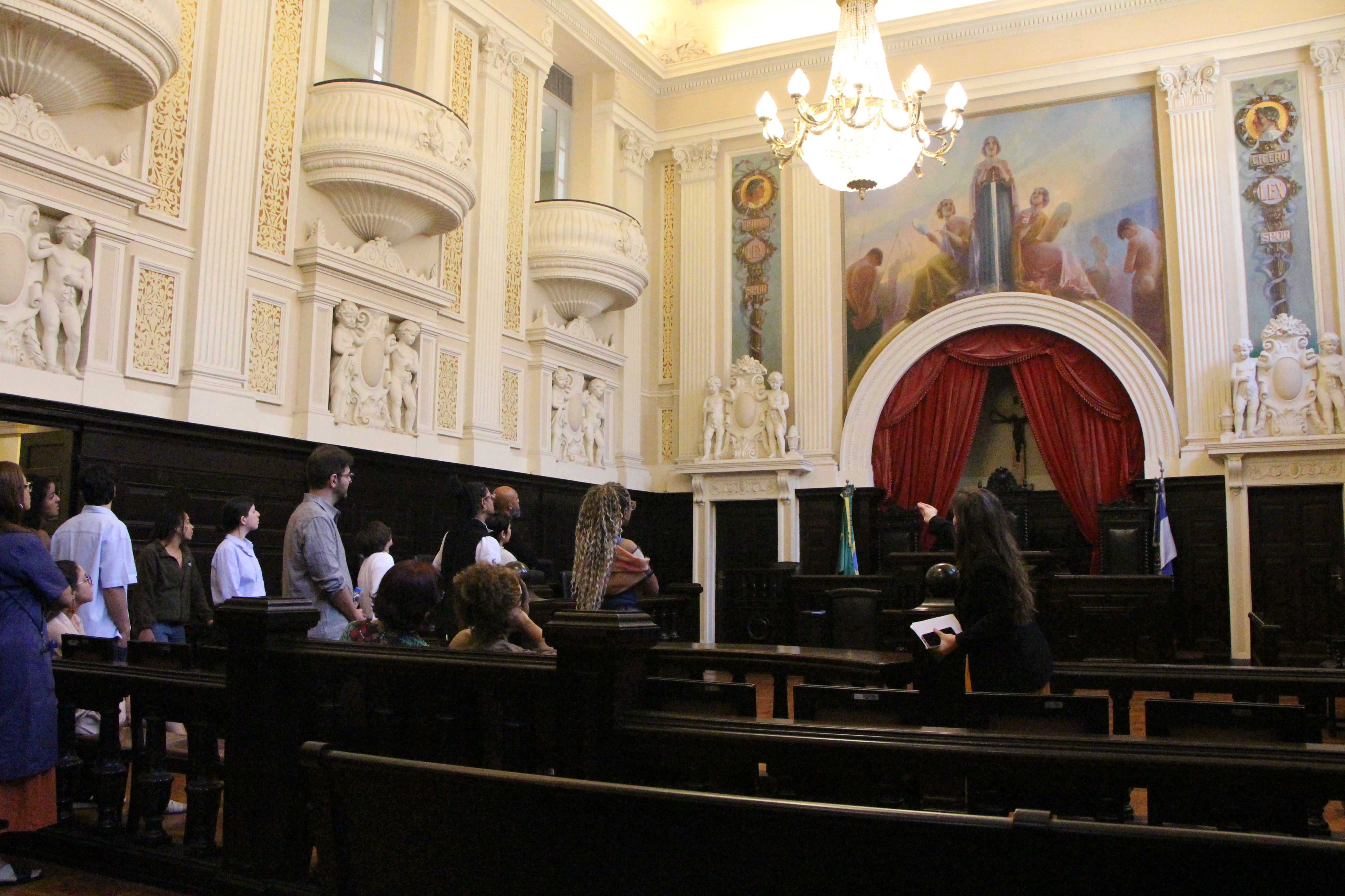 A Equipe do Educativo recebeu um grupo de artistas idosos residentes do Retiro dos Artistas, agendada pela Secretário-Geral de Sustentabilidade e Responsabilidade Social. Durante a visita, os participantes puderam explorar os espaços históricos do Antigo Palácio da Justiça com mediação de arte0educadoras e participaram de uma simulação de julgamento no Tribunal do Júri.