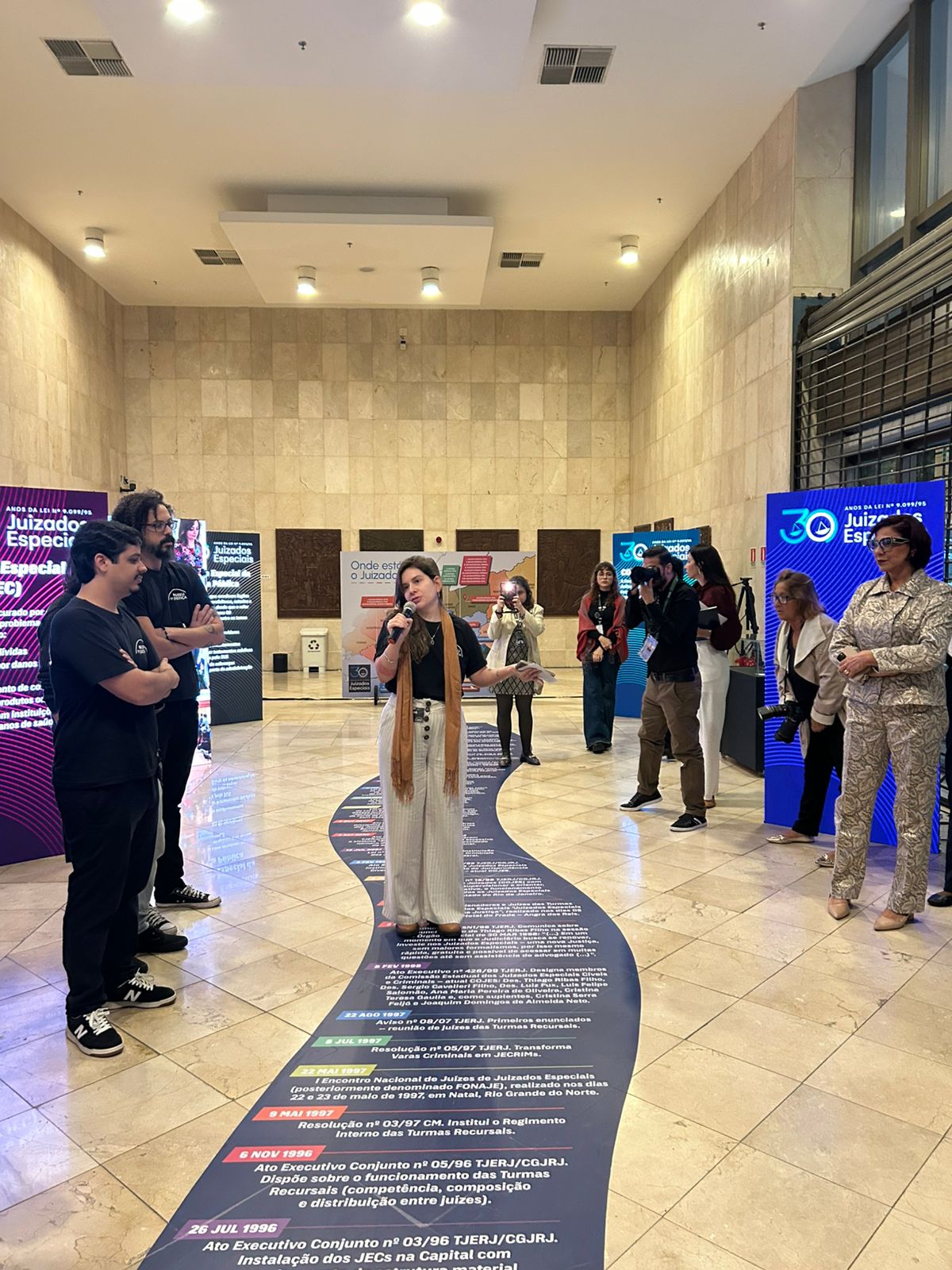 seguida, o percurso da exposição foi apresentado pelos historiadores Diego Bertucci e Lydia de Carvalho. "Memórias de um novo tempo: 30 anos dos Juizados Especiais" está aberta para visitação do pública de segundas às sextas, das 11h às 17h, até o dia 23 de outubro.
