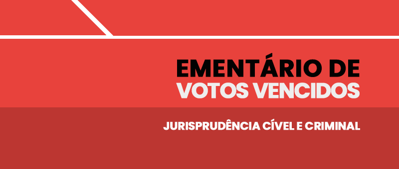 Nessa nova edição, foram selecionados votos vencidos cíveis que abordam os seguintes temas: empréstimo consignado de militar; isenção de custas em ação de adjudicação compulsória; ausência de ilegalidade em contrato bancário; deferimento de gratuidade de justiça em ação indenizatória; não comprovação da condição de vítima do evento gerando ilegitimidade autoral; cabimento do mandado de segurança em situação que não enseja o indeferimento da inicial; prescrição dos créditos tributários em ação de embargos à execução fiscal; fornecimento de água em condomínio residencial pelo consumo real aferido; concurso público e contratação de forma precária; utilização de equipamento similar no fornecimento de medicamento; inexigibilidade da cobrança de taxa condominial pela aplicabilidade de lei específica ; compatibilidade entre a multa e a obrigação principal de concessionária de energia elétrica; período de carência de plano de saúde. Dentre os votos vencidos criminais, destacam-se decisões referentes aos seguintes tópicos: readequação da pena de multa e necessidade de proporcionalidade com a pena privativa de liberdade; nulidade da prova obtida mediante violação de domicílio; pedido de revisão da dosimetria e atenuante da confissão espontânea não reconhecida; associação para o tráfico e impossibilidade de reexame da prova; decretação da prisão preventiva como garantia da ordem pública e aplicação da lei penal; roubo com modificação da dosimetria penal.