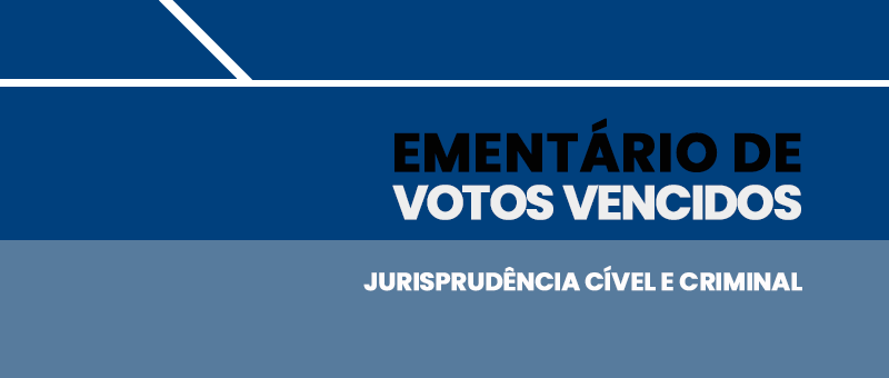 Nessa nova edição, foram selecionados votos vencidos cíveis que abordam os seguintes temas: prestação de saúde e medicamentos ; entrega de imóvel; implementação do piso salarial; fornecimento de água; execução fiscal; piso salarial nacional do magistério e implantação de reajuste; rio previdência, índices de reajuste e violação da norma de competência; ICMS e anulação de decisão administrativa; perícia médica; revisão de proventos de magistério; desconstituição de acórdão; busca e apreensão de veículo; não realização do depósito suplementar de ICMS; plano de saúde; Dentre os votos vencidos criminais, destacam-se decisões referentes aos seguintes tópicos: furto qualificado; impossibilidade de trancamento da ação penal; tráfico ilícito de entorpecentes; indeferimento de benefício; crime de falsidade material de atestado ou certidão; validade de reconhecimento fotográfico em sede policial; princípio da insignificância; ausência de comprovação de nexo causal.