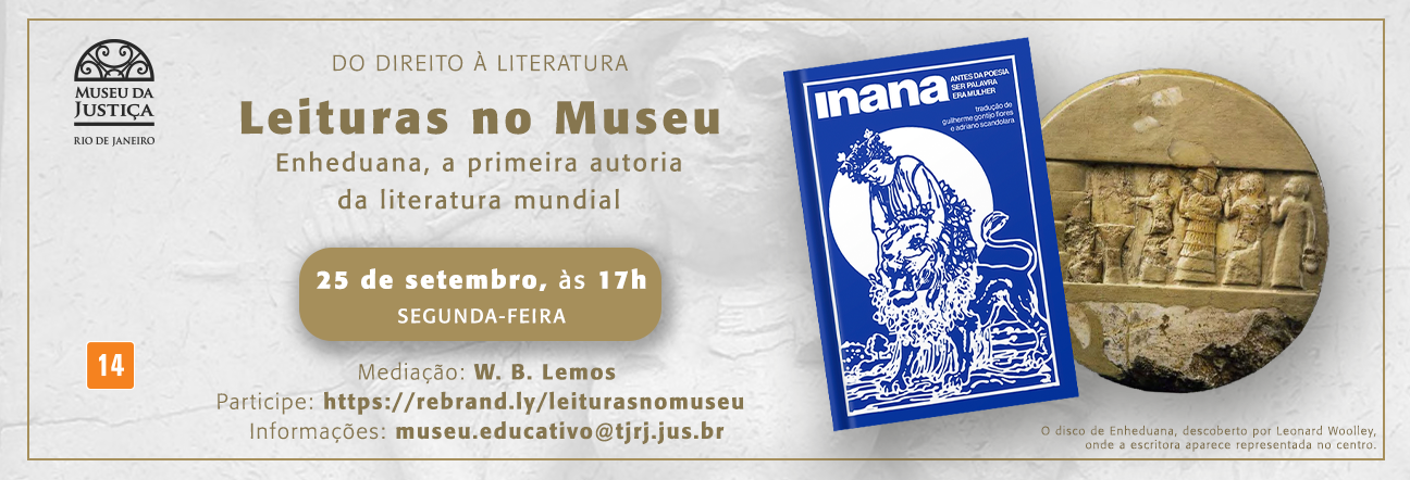No próximo encontro do Leituras no Museu, no dia 25 de setembro, às 17h, em celebração ao Dia Mundial do Tradutor, comemorado na data de 30 de setembro, discutiremos a recente tradução de dois dos poemas mais antigos da literatura mundial: A exaltação de Inana e A descida de Inana ao mundo dos mortos, escritos há mais de 4.000 anos, ambos de autoria da sacerdotisa e primeira poeta mulher da história, Enheduana, uma princesa do império mesopotâmico. Os poemas estão reunidos no livro Inana: antes da poesia ser palavra era mulher (2022), traduzidos pelos poetas Guilherme Gontijo Flores e Adriano Scandolara.