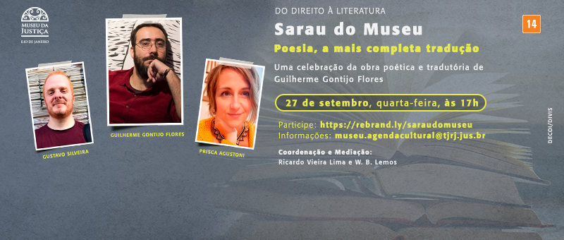 O Museu da Justiça, com o intuito de promover a leitura de poesia, realizará a 35ª Edição do Sarau do Museu – Poesia, a mais completa tradução, em formato virtual, no dia 27 de setembro de 2023, às 17h, como mais um dos desdobramentos do programa Do Direito à Literatura – Encontros Literários Interdisciplinares, série de ações que têm como objetivo buscar aproximações entre o Direito e as demais Humanidades. Nesta edição, celebraremos o Dia Mundial do Tradutor – comemorado no próximo dia 30 de setembro –, homenageando o poeta, tradutor, ensaísta e professor de latim na Universidade Federal do Paraná (UFPR), Guilherme Gontijo Flores. Doutor em Letras Clássicas pela Universidade de São Paulo (USP), é mestre em Estudos Literários pela Universidade Federal de Minas Gerais (UFMG) e Pós-Doutor pela Universidade Estadual Paulista (UNESP), campus de Araraquara. Publicou nove livros de poemas, dentre eles: brasa enganosa (2013); carvão :: capim (2018, finalista do Prêmio Rio de Literatura); Todos os nomes que talvez tivéssemos (2020, poesia reunida) e Potlatch (2022), além do romance História de Joia (2019). Tradutor experiente e bastante premiado, lançou, dentre outros, A anatomia da melancolia (em 4 volumes, entre 2011 e 2013), de Robert Burton, obra vencedora dos prêmios Jabuti e APCA de tradução; Elegias de Sexto Propércio (2014, Prêmio Paulo Rónai de Tradução, da Biblioteca Nacional); Fragmentos de Safo (2017, Prêmio APCA de Tradução); Ar-reverso, de Paul Celan (2021), e, mais recentemente, as Obras completas de François Rabelais. Foi coeditor do blog e revista escamandro. Neste ano de 2023, está lançando um novo livro de ensaio, Que sabe de si: o híbrido, a memória, a fúria, e uma nova e arrojada tradução: Seu dedo é flor de lótus – Poemas de amor do Antigo Egito.