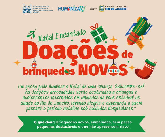 A campanha busca arrecadar brinquedos novos para crianças e adolescentes internados nas unidades da rede estadual de saúde, proporcionando momentos de alegria e conforto durante o período festivo. A iniciativa, apoiada pelo PJERJ de 2018 a 2024, reafirma seu compromisso com ações que promovem esperança e acolhimento àqueles que estão sob cuidados hospitalares.