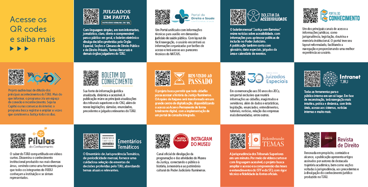 A atuação da SGCON também se expressa em produtos editoriais, audiovisuais e iniciativas voltadas à preservação da memória institucional, como o Boletim do Conhecimento, o Julgados em Pauta, os Ementários Temáticos, as Pílulas do Conhecimento, o projeto Relembrando Temas e o TJRJ em Ação, além da recente retomada da publicação da Revista de Direito do TJRJ, que agora retorna com um novo projeto editorial e gráfico.