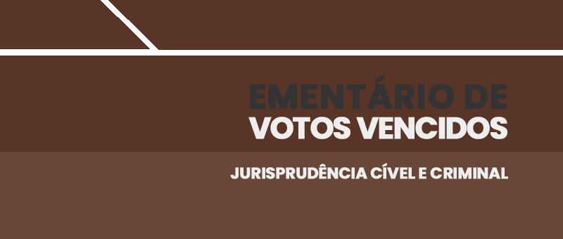 Nessa nova edição, foram selecionados votos vencidos cíveis que abordam os seguintes temas: transferência do acervo de cartório de registro civil em razão de óbito do titular; agravo interno de decisão que não conheceu de agravo de instrumento; condenação do Estado a pagar honorários advocatícios em favor da Defensoria Pública; limite de desconto de empréstimo consignado a pensionista de militar; cartão de crédito e ação de consignação em pagamento; dano moral em razão da instalação de equipamentos por concessionária de energia elétrica por ausência de distância mínima das moradias; revogação de ato que averbou tempo de serviço como aluno aprendiz; impossibilidade de fixação de honorários por equidade devidos à Defensoria Pública; inadimplência em contrato de financiamento imobiliário de compra e venda . Dentre os votos vencidos criminais, destacam-se decisões referentes aos seguintes tópicos: atribuição de efeito modificativo aos embargos de declaração; violação de direito autoral; inexistência de prova suficiente para a condenação por tráfico ilícito de entorpecentes; inaplicabilidade do princípio da insignificância; validade do depoimento de policiais; venda de medicamentos sem registro na ANVISA e impossibilidade de reconhecimento de tráfico privilegiado.